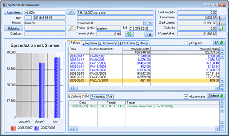 Okno sprzedaży dedykowanej to narzędzie efektywnie podwyższające jakość obsługi stałych Klientów. Oprócz możliwości szybkiego wystawienia dokumentów na danego kontrahenta, okno to zawiera wszystkie kluczowe informacje dotyczące kontrahenta: